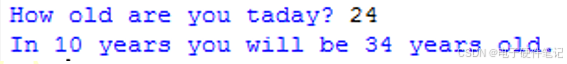 age10=int(age)+10 print('In 10 years you will be '+str(age10)+' years old.') #用逗号分隔亦可,只是前后分别有1个空格,格式上不好控制。