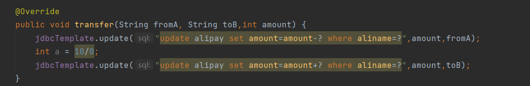 jdbcTemplate.update("update alipay set amount=amount-? where aliname=?",amount,fromA);