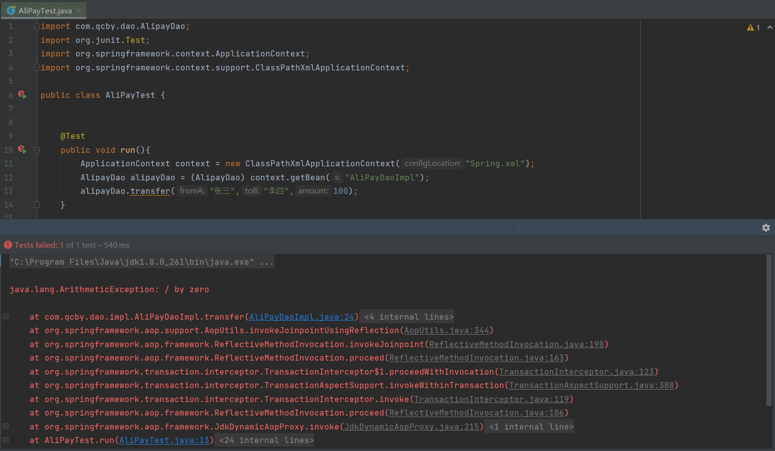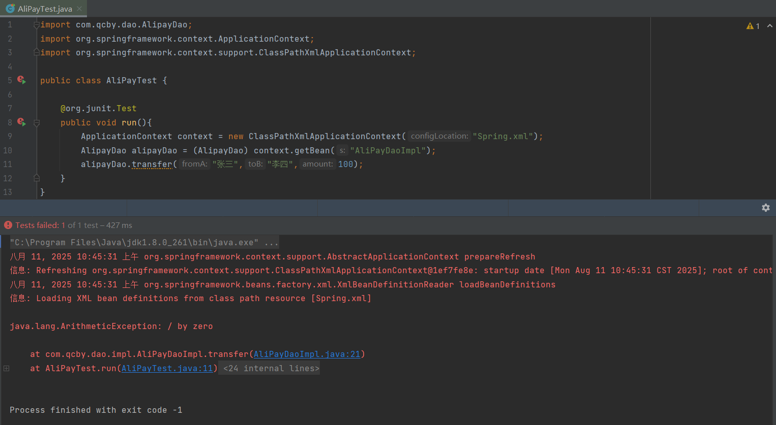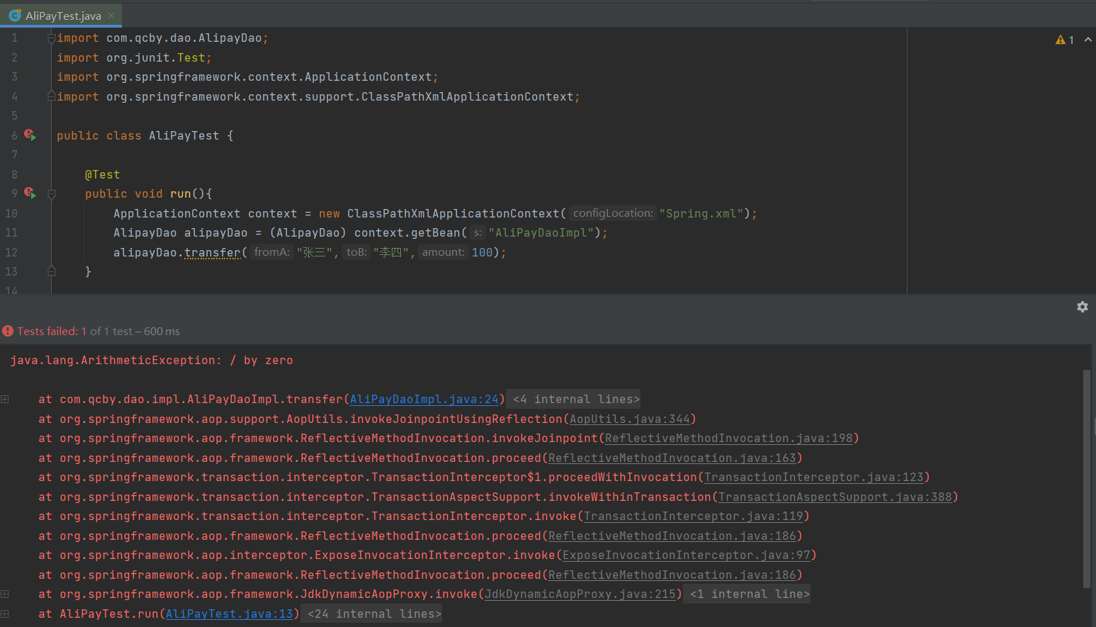 此时我们将数据库的数据重置为各是100,再将AliPayDaoImpl.java改为: