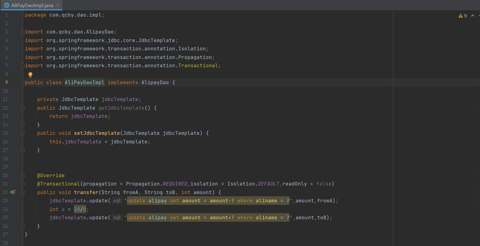 定义了数据访问层实现类 AliPayDaoImpl,主要功能是实现账户间的转账操作 transfer()。JdbcTemplate 是 Spring JDBC 的核心工具类,类中定义了 JdbcTemplate 对象,并提供了 get/set 方法,这是为了通过 Spring 的依赖注入获取 JdbcTemplate 实例。这种通过 setter 方法注入的方式,使得 JdbcTemplate 可以由 Spring 容器统一管理,无需手动创建。
