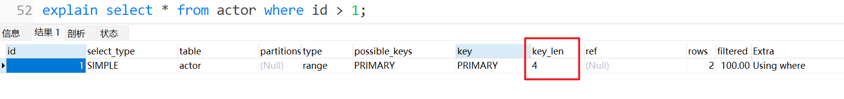 这一列显示了mysql在索引里使用的字节数,通过这个值可以算出具体使用了索引中的哪些列。