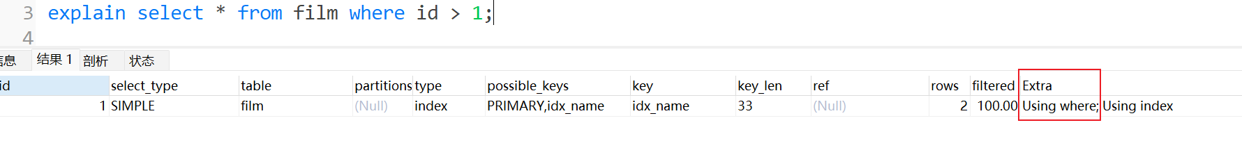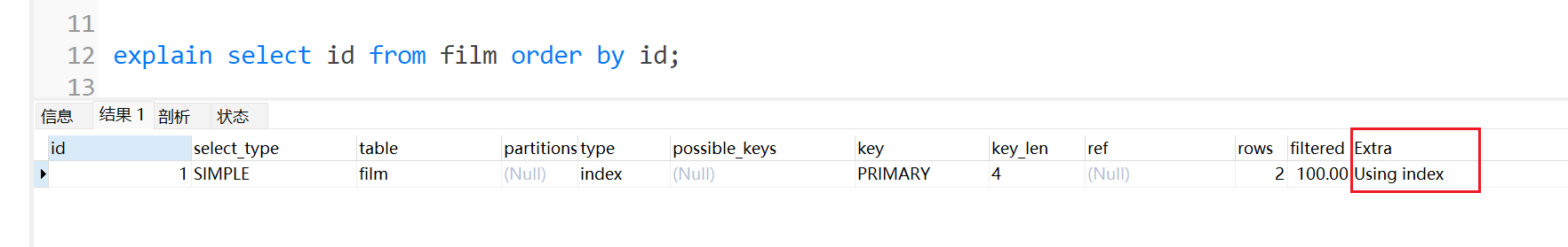 这发生在对表的请求列都是同一索引的部分的时候,返回的列数据只使用了索引中的信息,而没有再去访问表中的行记录。是性能高的表现。