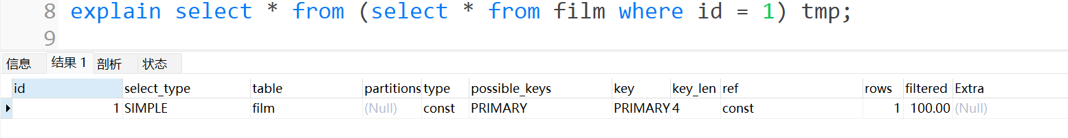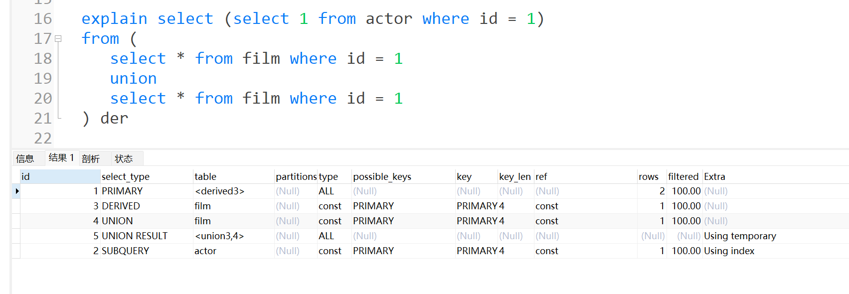 3.derived:包含在 from 子句中的子查询。MySQL会将结果存放在一个临时表中,也称为派生表(derived的英文含义)