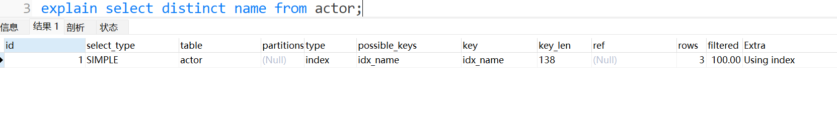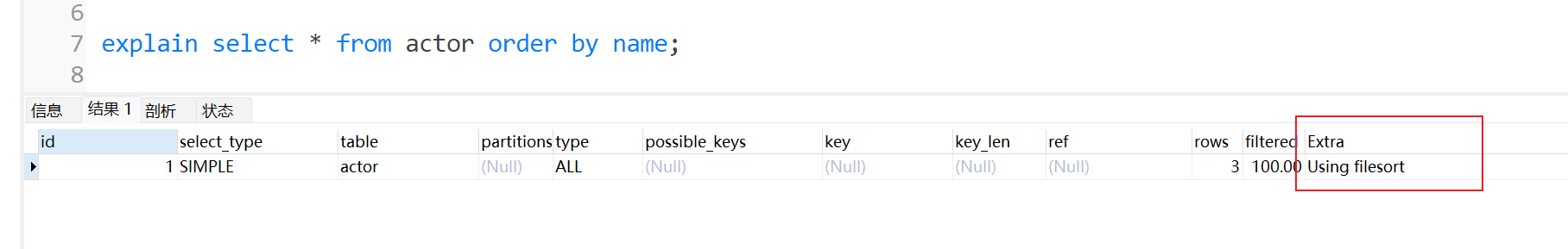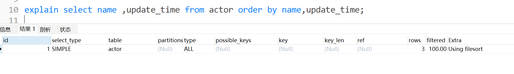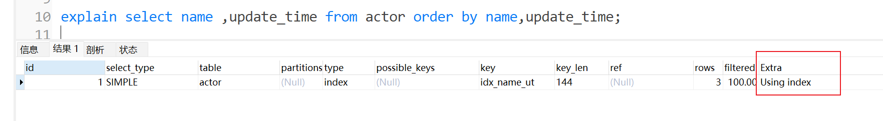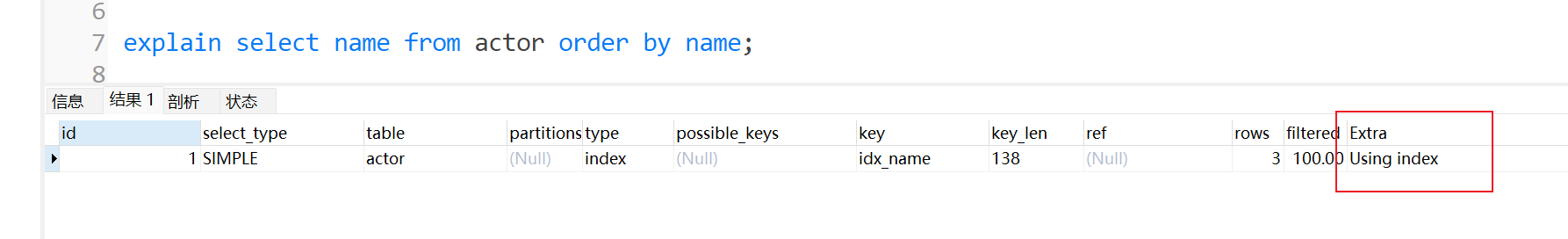 这里可能会产生疑惑,已经在name字段上创建了索引,为什么排序还是文件排序,没有用到索引呢,这是因为对于排序,只有select 字段 与order by 字段都被索引覆盖是才允许使用Using Index。把查询语句中的*改成name,再看下效果: