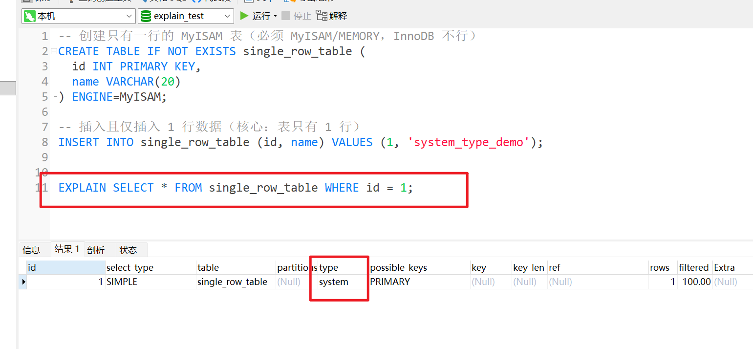查询的表只有 0 或 1 行(表的数据库引擎必须是 MyISAM或MEMORY,InnoDB 不行),system效率最高。
