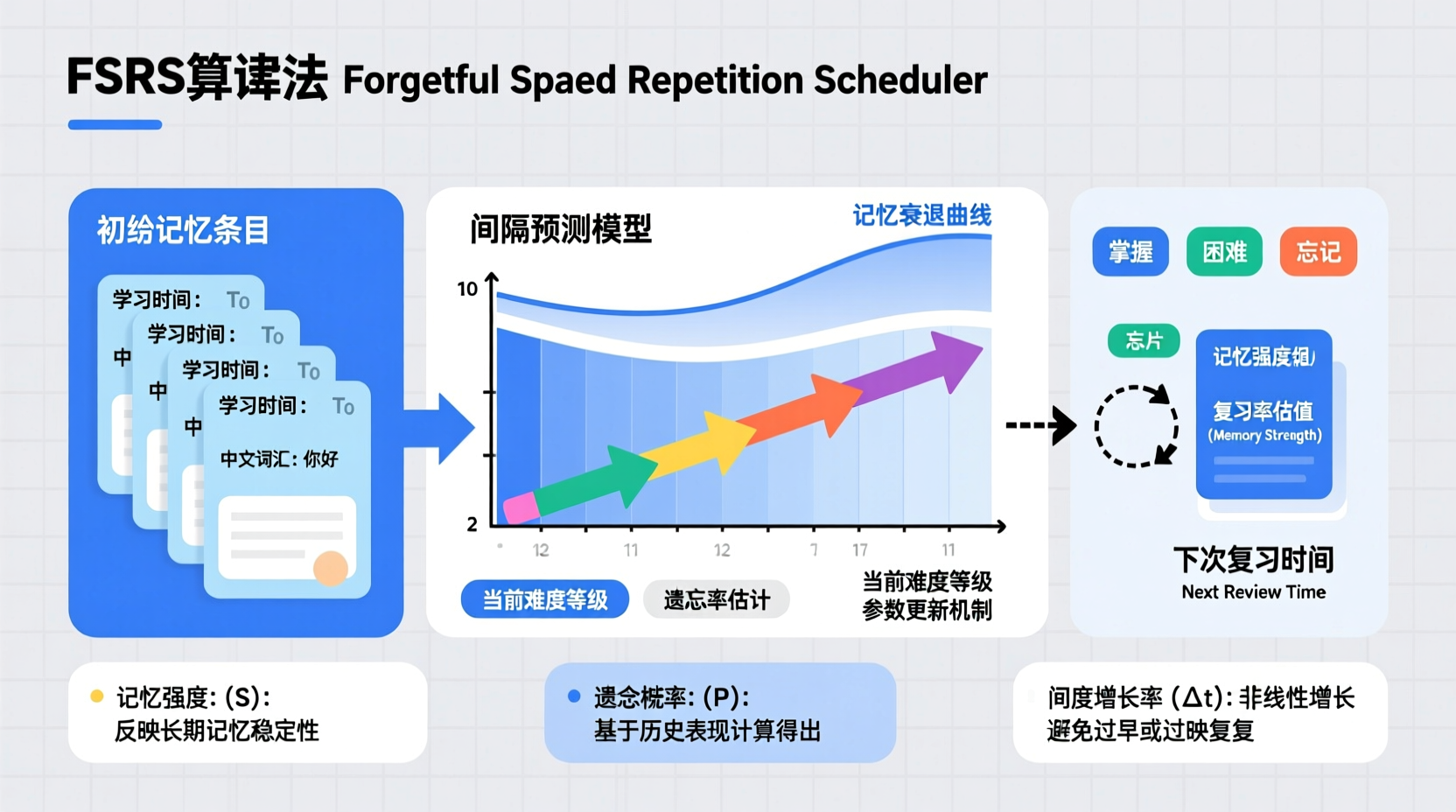 这种基于实际表现反馈的动态调整机制,使得FSRS能够逐渐适应个体的记忆特征和学习内容特性。