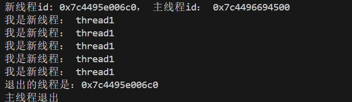 cppint main() { pthread_t tid; pthread_create(&tid, nullptr, thread_func, (void *)"thread1"); printf("新线程id: 0x%lx, 主线程id: 0x%lx\n", tid,pthread_self()); pthread_join(tid, nullptr); printf("退出的线程是:0x%lx\n", tid); std::cout << "主线程退出" << std::endl; return 0; }我们在主线程中使用pthread_self获取主线程id,然后利用pthread_create的第一个输出型参数获取新线程的id