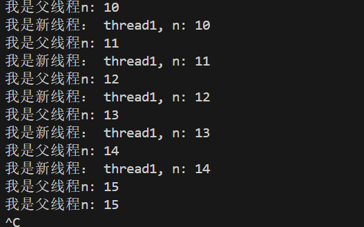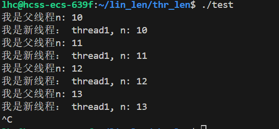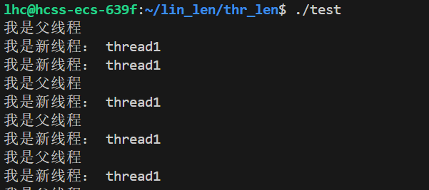 cpp#include <iostream> #include <cstdio> #include <pthread.h> #include <unistd.h> void *thread_func(void *n) { while (true) // 新线程 { printf("我是新线程: %s\n",(char*)n); sleep(1); } } int main() { pthread_t tid; pthread_create(&tid, nullptr, thread_func, (void *)"thread1"); while (true) // 父线程 { std::cout << "我是父线程" << std::endl; sleep(1); } return 0; }结果演示: