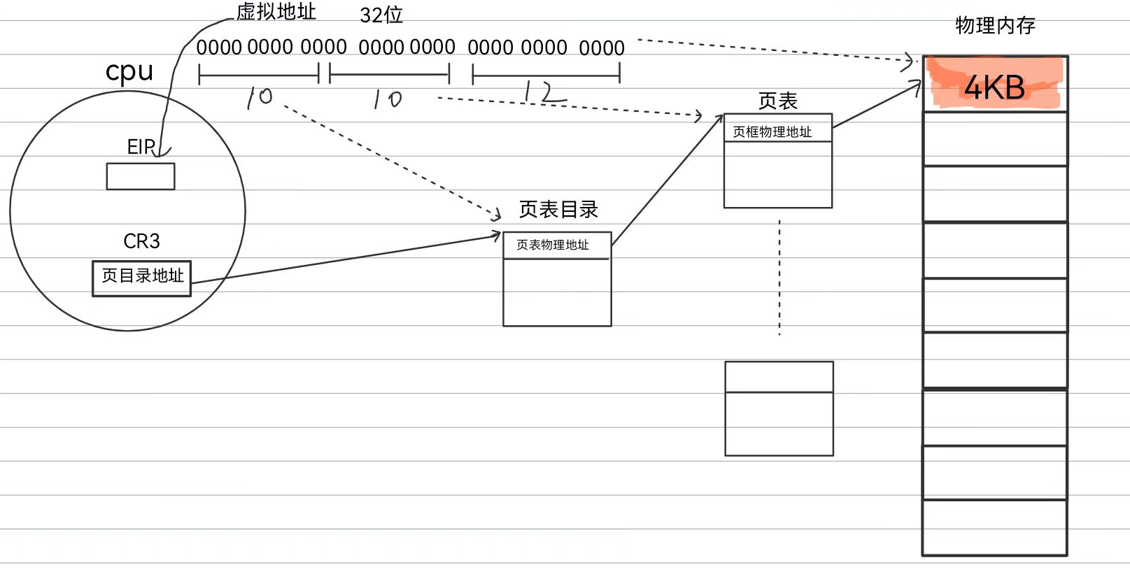 图示:前置知识:32位计算机中,虚拟地址总共4字节,32个bit位,其中高10位是页目录表偏移项,次高10位是页表偏移项(页表只能定位到页框),低12位是页框内偏移量(最后定位到1字节级别)