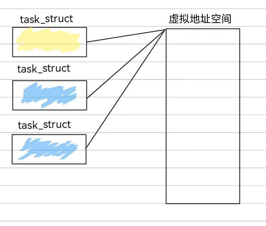 黄色的task_struct是进程管理的,后面蓝色的是线程管理的,他们都指向同一个进程的虚拟地址空间,然后通过分配不同的入口函数地址来达到执行流资源分配的目的