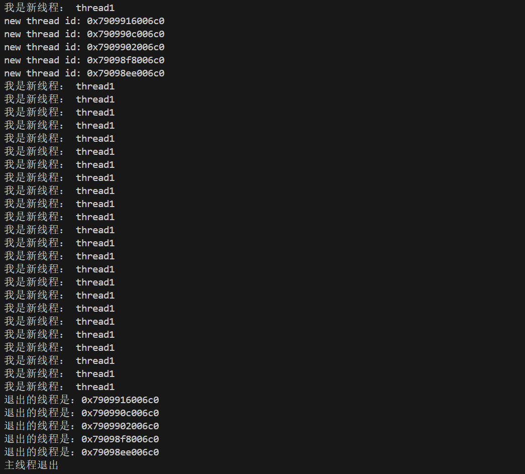 cpp#include <iostream> #include <cstdio> #include <pthread.h> #include <unistd.h> #include <vector> // volatile int n = 10; void *thread_func(void *s) { int cnt = 5; while (cnt--) // 新线程 { printf("我是新线程: %s\n", (char *)s); sleep(1); } return nullptr; } int main() { std::vector<pthread_t> tidv; for (int i = 1; i <= 5; i++)//批量创建新线程 { pthread_t tid; pthread_create(&tid, nullptr, thread_func, (void *)"thread1"); tidv.push_back(tid); } for(auto &e :tidv) printf("new thread id: 0x%lx\n",e); for(auto &e :tidv) { pthread_join(e,nullptr); printf("退出的线程是:0x%lx\n",e); } std::cout << "主线程退出" << std::endl; return 0; }创建pthread_t类型数组,将新创建出来的线程tid都存储起来,然后将其依次打印以体现确实创建了对应线程,最后回收新线程后将回收成功的线程打印出来,所有线程回收完成,主线程退出
