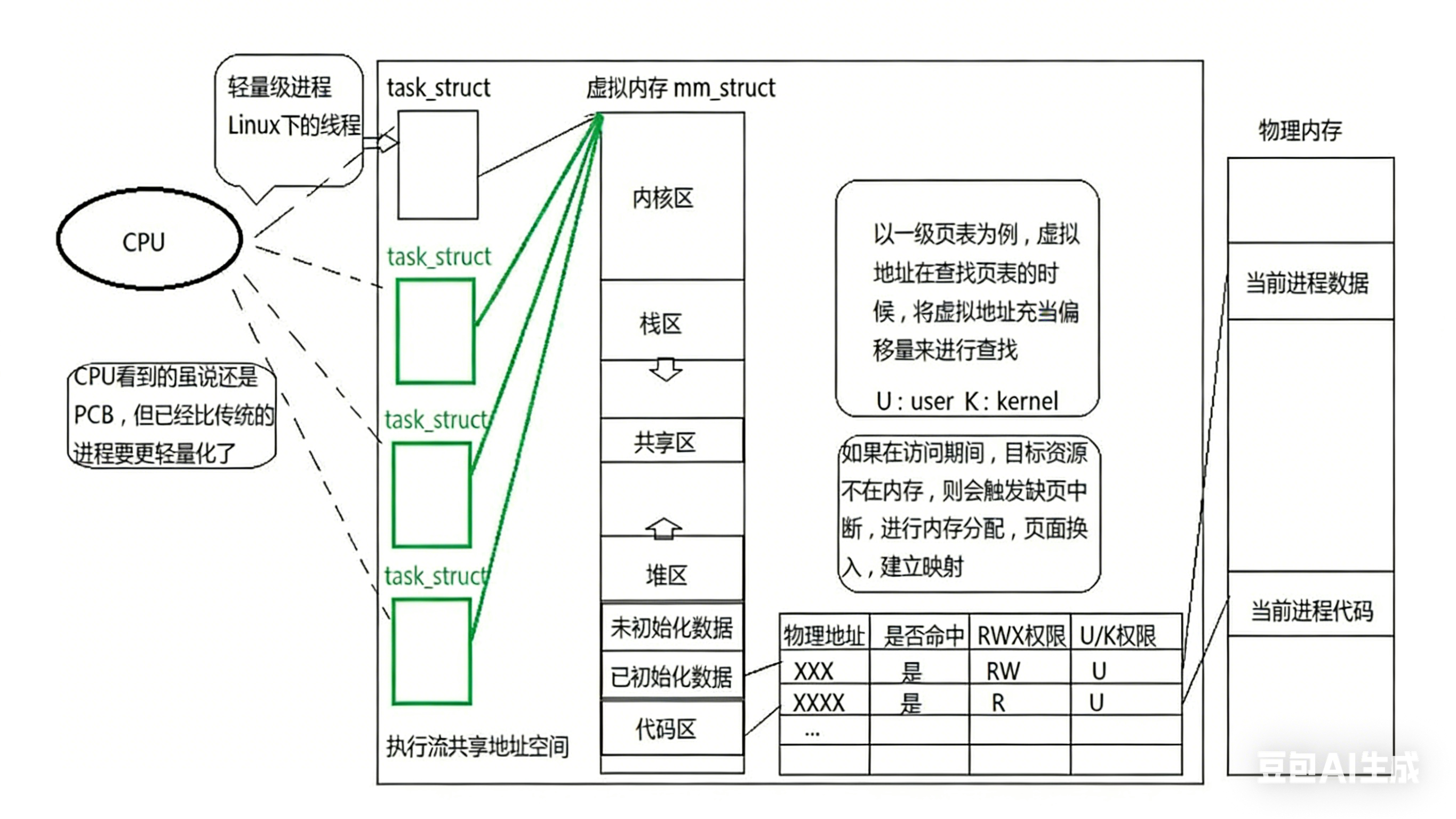 绿色部分的task_struct就是线程,后续线程的叫法是主线程和新线程,要和进程的区分开