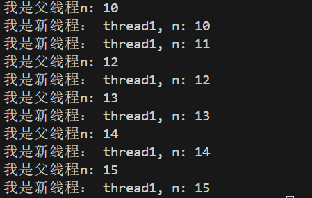 cpp#include <iostream> #include <cstdio> #include <pthread.h> #include <unistd.h> volatile int n = 10; void *thread_func(void *s) { while (true) // 新线程 { printf("我是新线程: %s, n: %d\n",(char*)s,n); n++; sleep(1); } } int main() { pthread_t tid; pthread_create(&tid, nullptr, thread_func, (void *)"thread1"); while (true) // 父线程 { std::cout << "我是父线程" << "n: " << n << std::endl; sleep(1); } return 0; }定义全局变量n,在主线程和新线程中都进行变量值打印,但是只在新线程中进行变量++