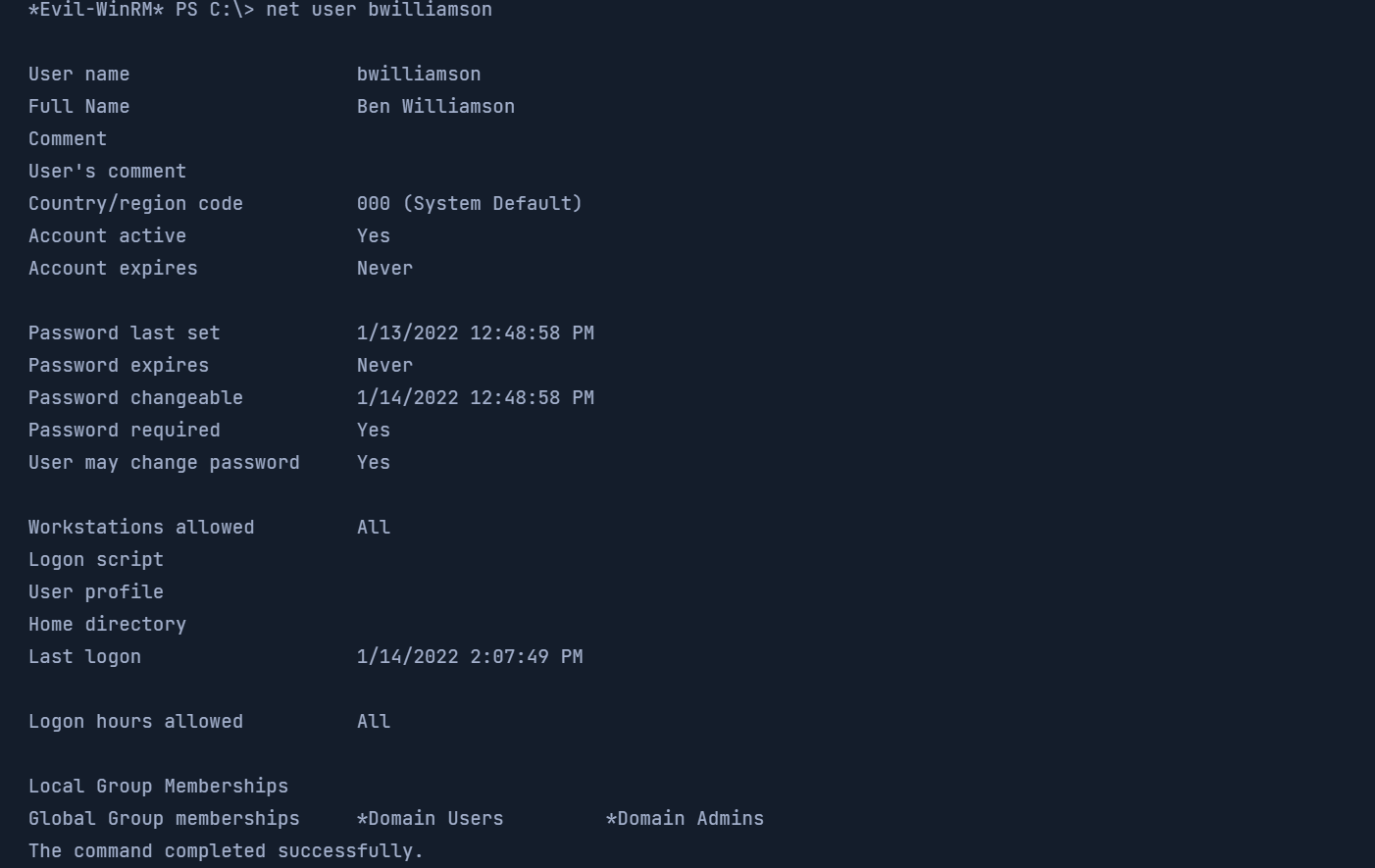 evil-winrm -i 10.129.201.57 -u bwilliamson -p 'P@55w0rd!'