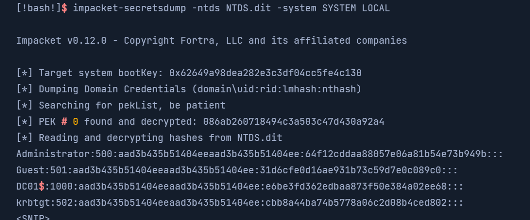 impacket-secretsdump -ntds NTDS.dit -system SYSTEM LOCAL