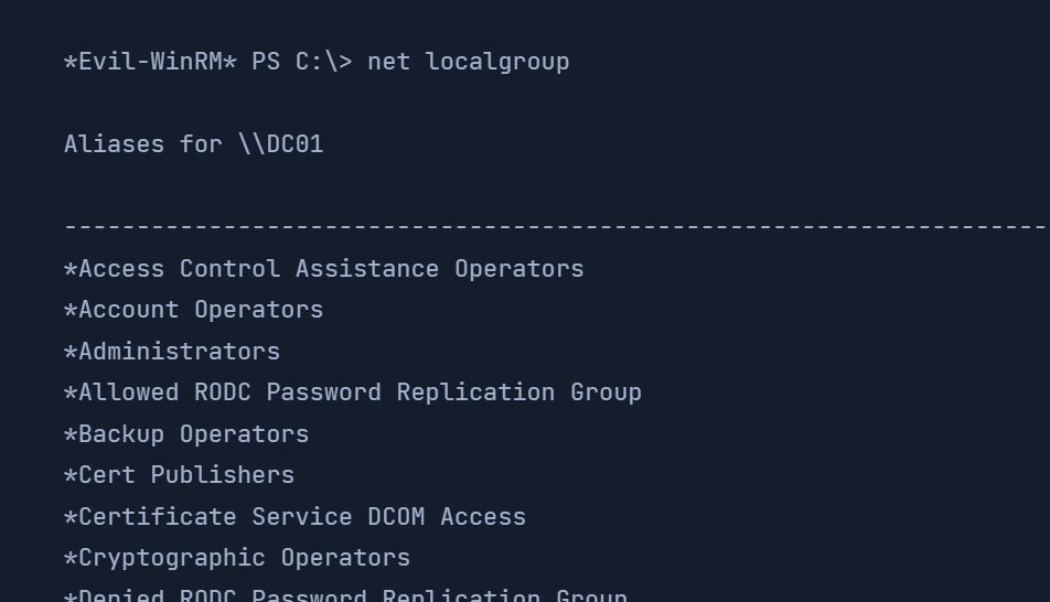要拿到NTDS.dit需要local admin(Administrators Group)或Domain Group(Domain admins group)权限,所以连接后可以看下: