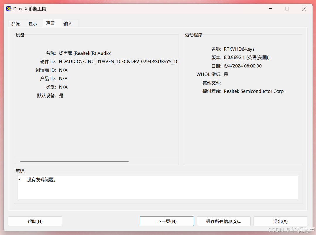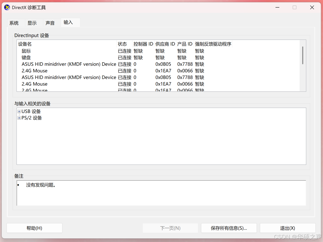 切换 "显示" 选项卡看显卡型号、显存,"声音" 选项卡看声卡信息,"输入" 选项卡看键盘鼠标设备;