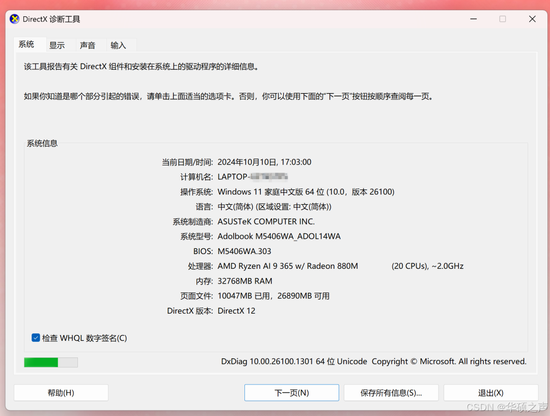 弹出 "DirectX 诊断工具",默认显示 "系统" 选项卡(CPU、内存、系统版本);