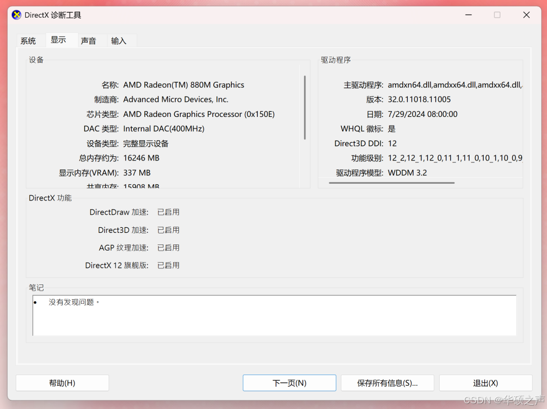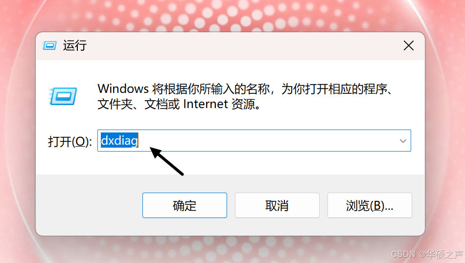 按 WIN+R 打开运行窗口,输入 dxdiag 按回车;