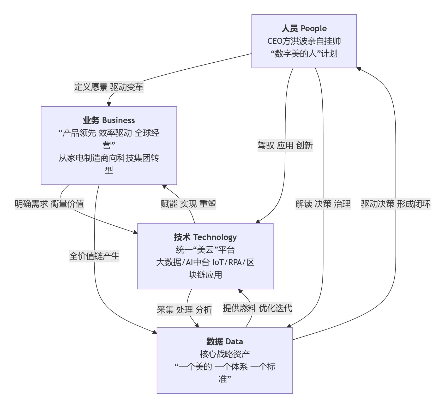 在美的集团的数字化转型中,以云计算、物联网、大数据、人工智能、RPA和区块链 为代表的前沿技术,被系统地融入研发、生产、营销与服务的全价值链,驱动集团从家电制造商向科技集团跃升。这一变革并非单纯的技术堆砌,而是业务、技术、数据、人员 四大要素深度协同的动态进程:明确的"产品领先、效率驱动"业务 战略引领方向;统一的"美云"与中台技术 架构提供支撑;"一个美的、一个标准"的数据 治理体系驱动闭环优化;而由顶层推动、全员参与的人员与文化变革,则从根本上保障了转型落地。四者互为因果、循环增强,共同构建了美的在数字时代的核心竞争力。
