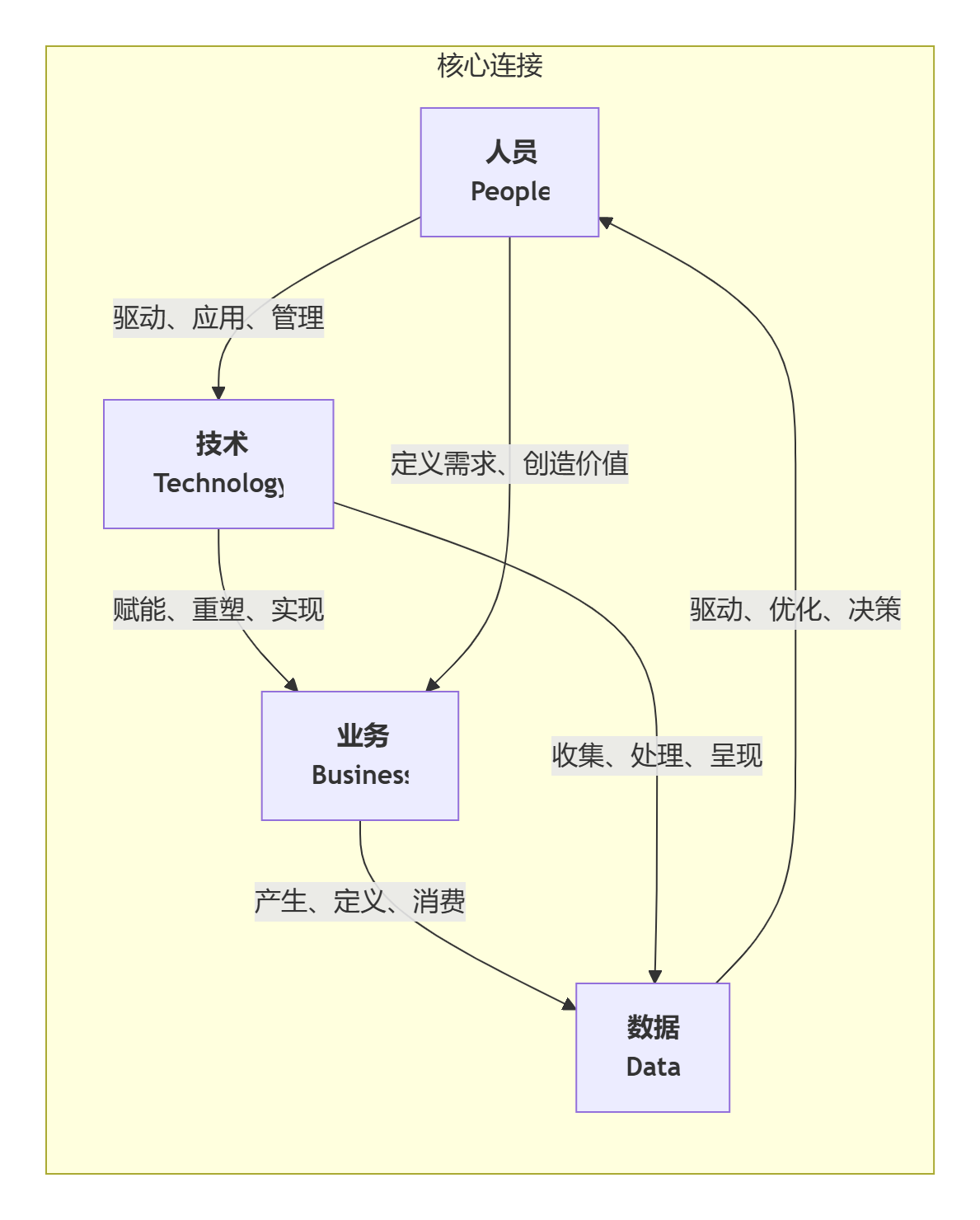 在数字化转型中,业务是"为什么"转型,人员是"谁"来转型,技术是"用什么"转型,数据是"依靠什么"转型 。成功的转型不是孤立地优化任何一个要素,而是致力于优化这四个要素之间的连接、流动和反馈循环 ,构建一个以业务价值为导向、以人为中心、以数据为驱动、以技术为支撑的敏捷、智能的新型组织。