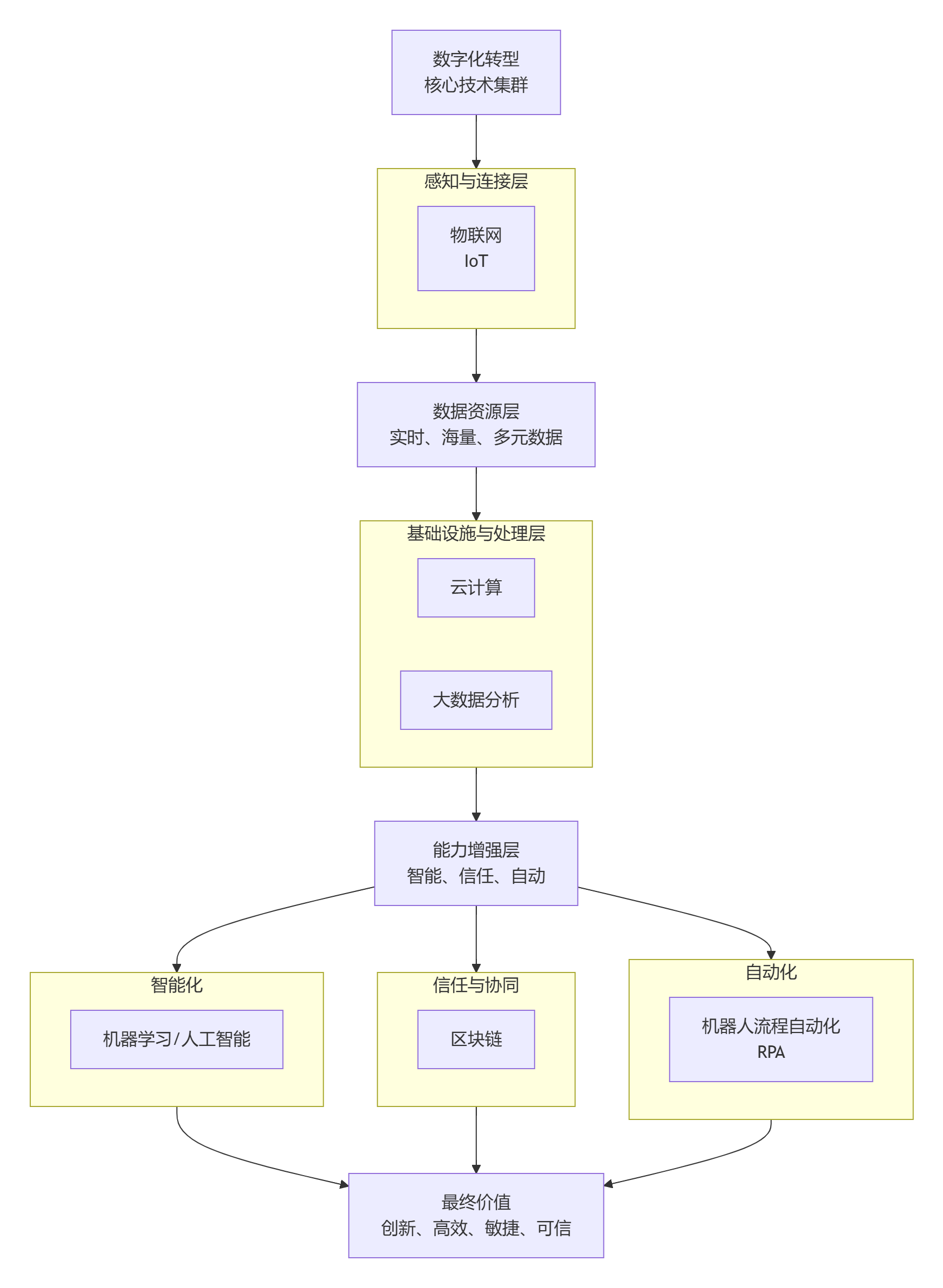 数字化转型并非单一技术的应用,而是以数据为燃料 ,以云计算为平台 ,通过IoT 收集,用大数据和AI 分析处理,用RPA 自动执行,并由区块链 确保可信的系统性工程 。其核心目标是构建一个更加敏捷、智能、以客户为中心、具备韧性和创新能力的组织或社会。