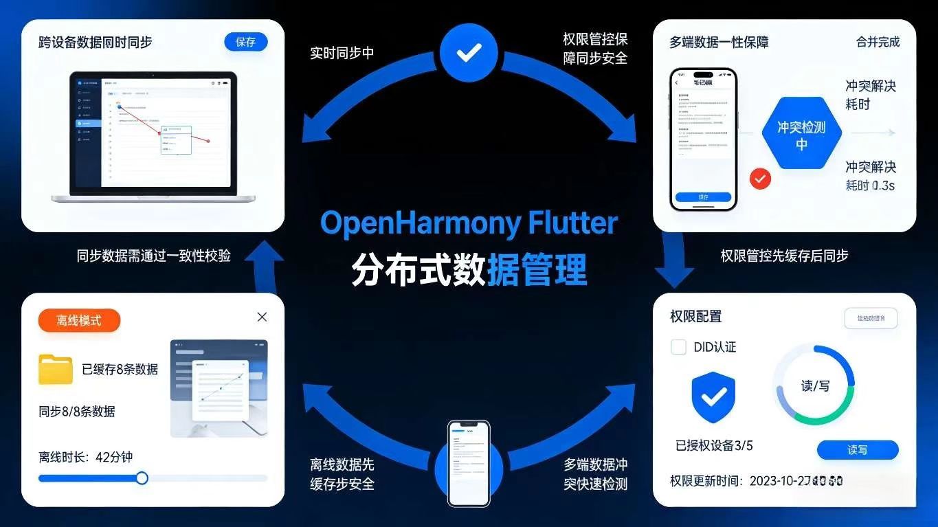 本文聚焦分布式数据管理 这一核心选题,以开源鸿蒙的分布式数据同步协议、数据一致性算法为技术底座,结合 Flutter 的Provider/Riverpod状态管理与本地存储能力,通过 "跨设备数据实时同步、多端数据一致性保障、数据权限精细管控、离线数据读写与同步" 四大实战场景,详解分布式数据管理的实现方案。本文字数约 3000 字,包含 7 个核心代码块,技术细节丰富,适用于多设备数据协同类分布式应用开发。