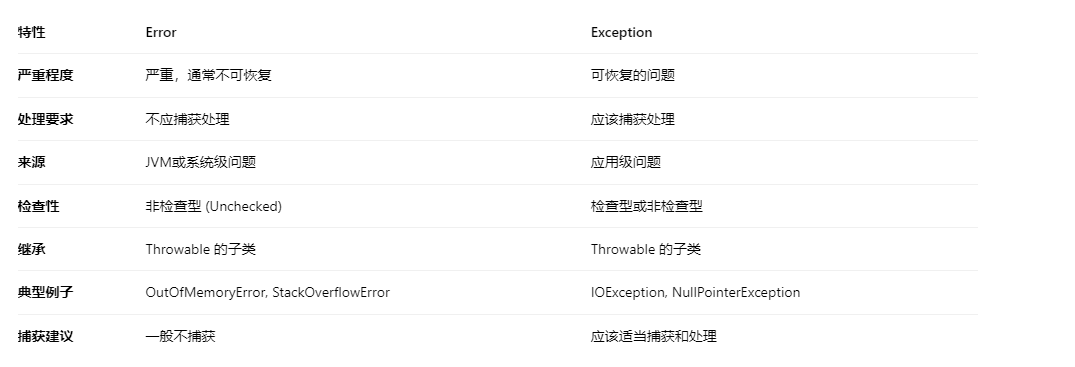 而Exception 代表着例外,需要捕获处理,让程序进行下去.可以返回给前端,让其提醒用户规避