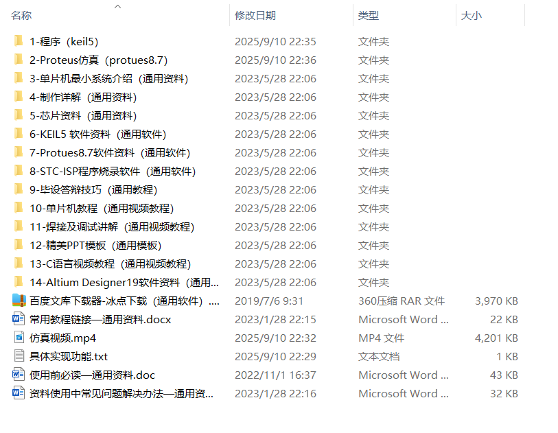 全部资料包括程序(keil5)、protues仿真(protues8.7)、设计说明、答辩PPT、开发资料、资料使用介绍、仿真视频、最小系统介绍视频等。
