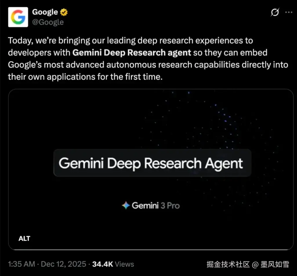 但谷歌刚刚发布的 Gemini Deep Research Agent,似乎打算终结这个"抢答时代"。这不仅仅是一个新模型,更像是谷歌在 AI 工业化进程中投下的一枚深水炸弹。基于 Gemini 3 Pro 构建,这个智能体不只是在回答问题,它在真正地"做研究"。