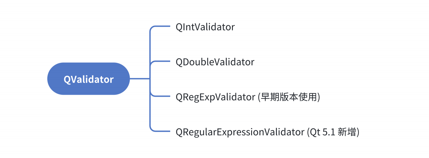 - 通过 QRegExpValidator 创建验证器对象。Qt 框架内置提供了四种主要类型的验证器。