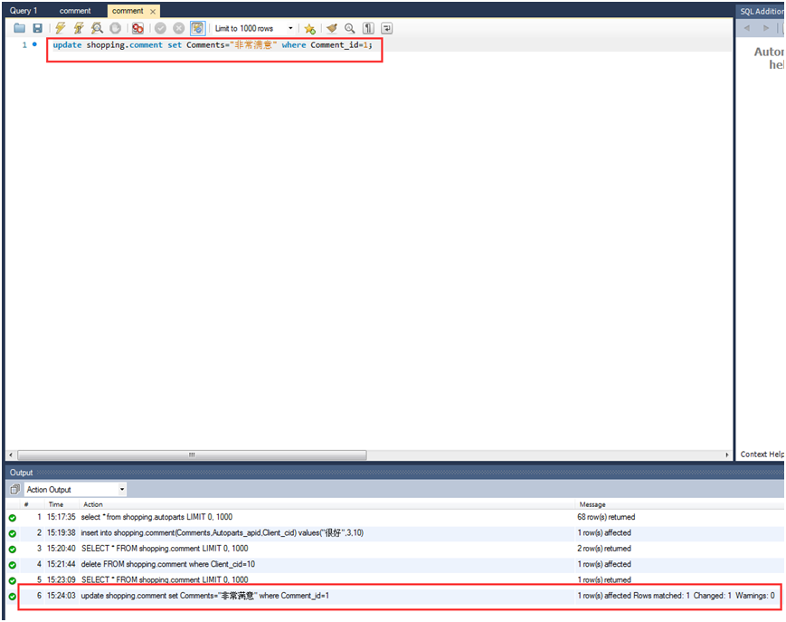 update shopping.comment set comments="非常满意" where comment_id=1;