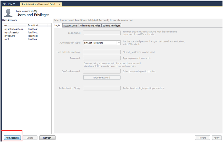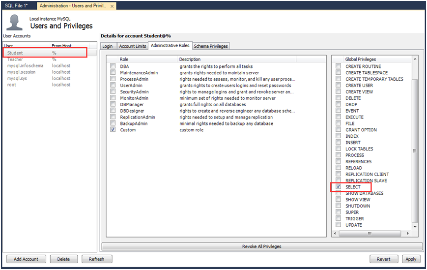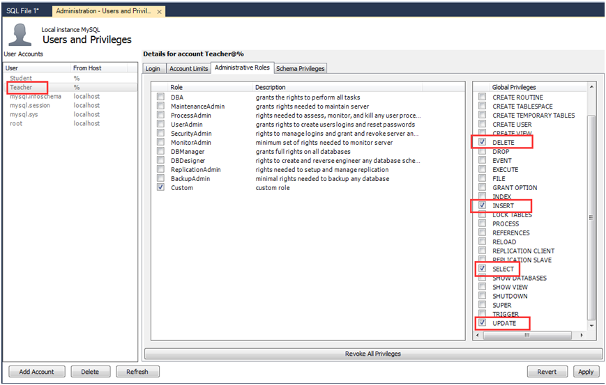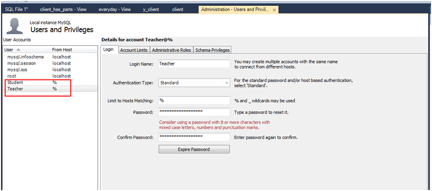 创建一个用户名为'Teacher'密码为'T99999'的用户;创建一个用户名为'Student'密码为'S11111'的用户。