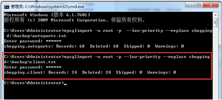 mysqlimport --u root -p --low-priority --replace shopping d:\backup\client.txt