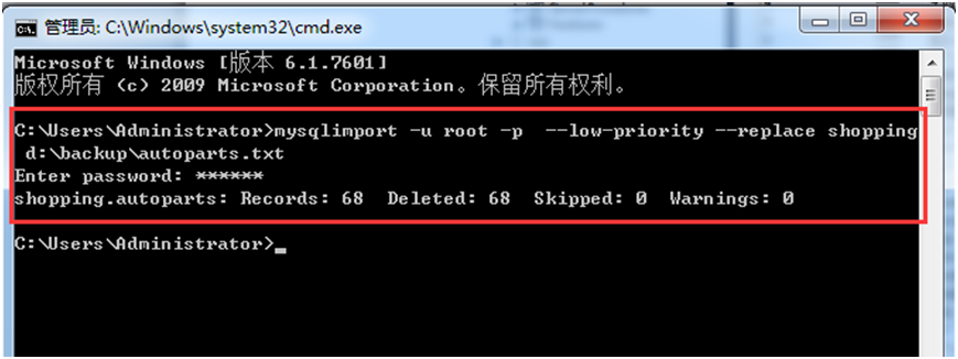 mysqlimport --u root -p --low-priority --replace shopping d:\backup\autoparts.txt