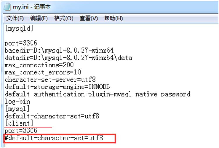 这时要把my.ini文件中[client]下的default-character-set=utf8注释掉,不再使用mysqlbinlog工具时,再把#default-character-set=utf8恢复为default-character-set=utf8,如下所示: