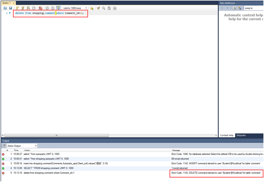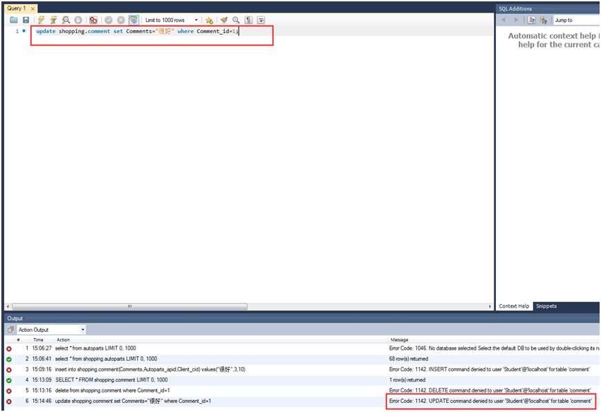 2.以'Student'用户身份操作Shopping数据库: