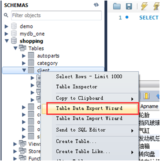 3.使用MySQL Workbench导出会员表和汽车配件表: