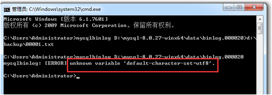 注:如果使用mysqlbinlog时,提示"unknown variable 'default-character-set=utf8'.",如下: