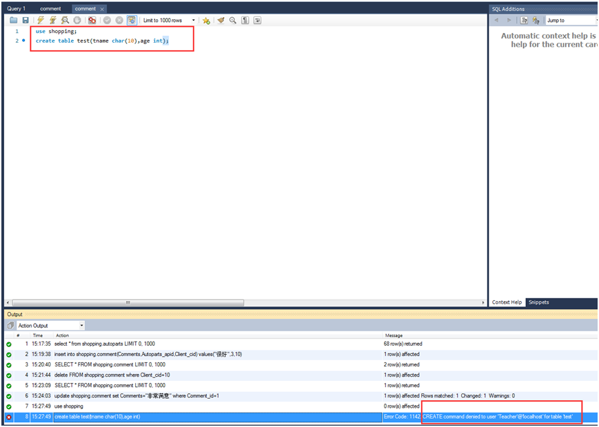 【实验6-3】以'Teacher'用户身份连接Shopping数据库,分别执行SELECT、INSERT、DELETE、UPDATE、CREATE操作,查看执行结果;以'Student'用户身份连接Shopping数据库,执行SELECT、INSERT、DELETE、UPDATE操作,查看执行结果。