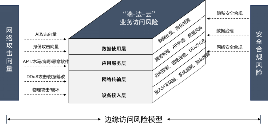 聚焦于外部的技术性威胁,主要指"谁来攻击、用什么方式攻击"。在边缘网络中,典型的网络攻击向量包括:AI攻击向量、身份攻击向量、APT/木马/病毒/恶意软件、DDoS攻击/数据篡改、物理攻击/破坏。