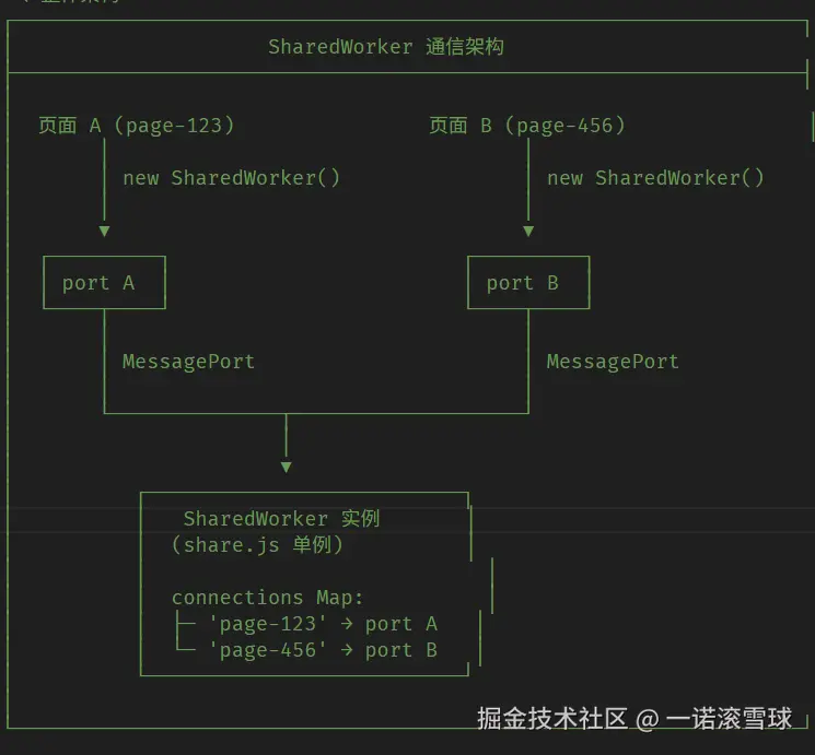 new SharedWorker('./share.js')创建实例时,浏览器会启动一个SharedWorker后台线程,加载指定的脚本文件,这个脚本文件是共享。 - 端口建立:每个页面连接到SharedWorker后,都会与Worker建立一个独立的"消息端口"(MessagePort),这是页面与Worker之间的通讯通道。