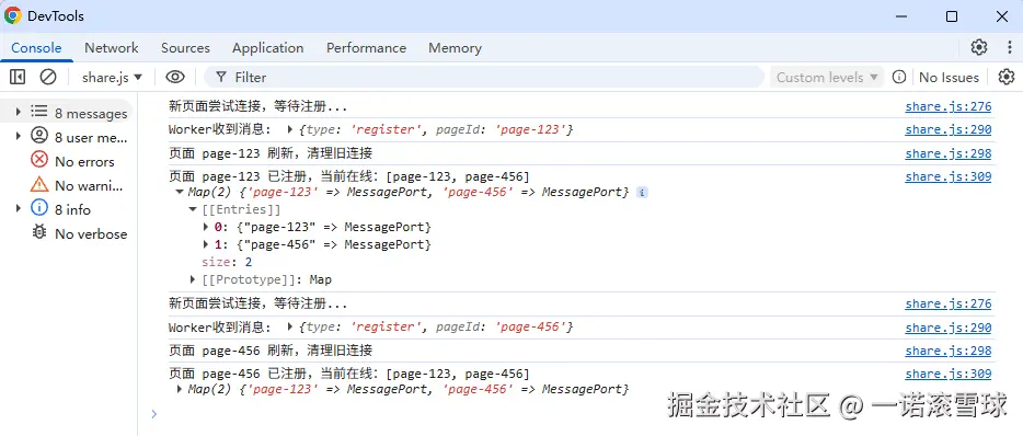 share.js的核心逻辑:是使用Map结构,通过connect将所有连接Worker的页面进行收集端口,每个页面需要唯一的pageId用于后续私发消息。