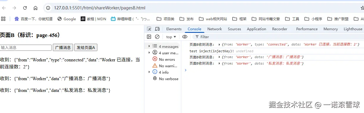 - 同时打开两个页面,在页面A输入消息并点击"广播消息",两个页面都会收到Worker转发的消息。