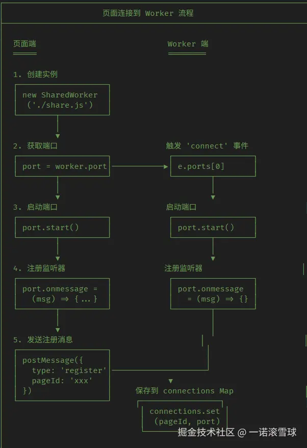5. Worker 保存连接到 Map: connections.set(pageId, port)