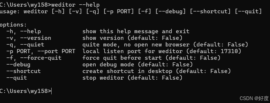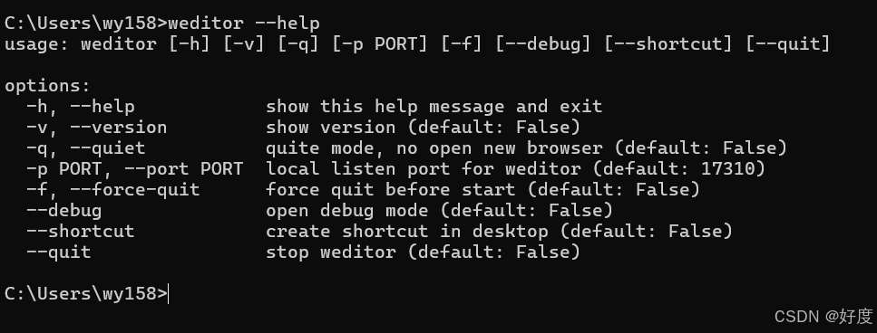 再cmd再次输入"weditor --help" 应该就可以看到下图内容了