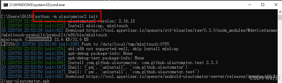 第一步安装UIautomator2,cmd命令:pip install UIautomator2